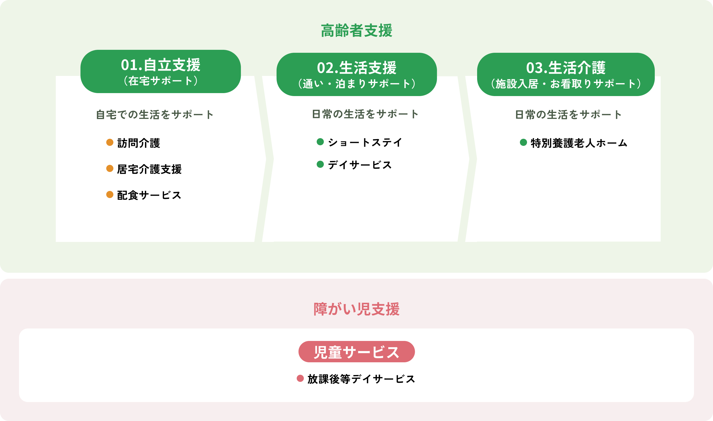私たちは、長年地域に根ざした福祉施設として、住み慣れた環境の中で安心してお過ごしいただけるケアを提供しています。デイサービス、ショートステイ、特別養護老人ホームまで、一貫した介護サービスを通じて、利用者様お一人おひとりの生活に寄り添いながら、切れ目のない安心をお届けします。