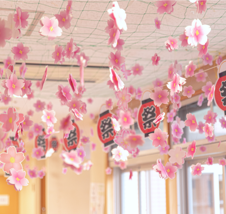 当施設では、自然に触れ、楽しみながら健康に過ごせる環境を大切にしています。敷地内には四季折々の風景を楽しめる散歩道があり、春には桜、端午の節句にはこいのぼりが風になびくなど、季節の移り変わりを感じながらゆったりと過ごせます。